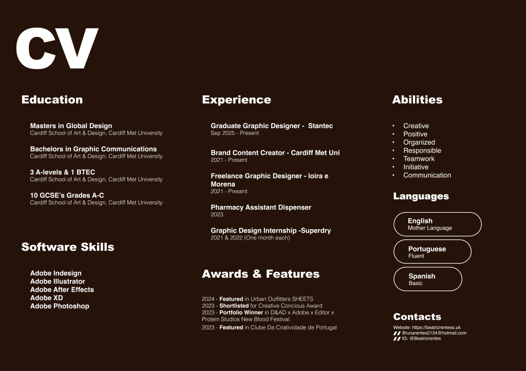 I’m Beatriz Rentes, a multidisciplinary designer and visual artist with a passion for graphic design, problem-solving, and visual storytelling. With a Master’s degree in Global Design from Cardiff School of Art and Design, I specialise in branding, illustration, and ethical design—always with a strong focus on human-centred design and its broader impact.