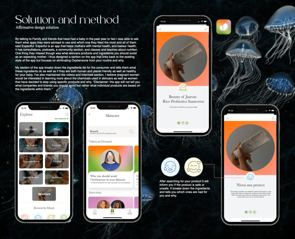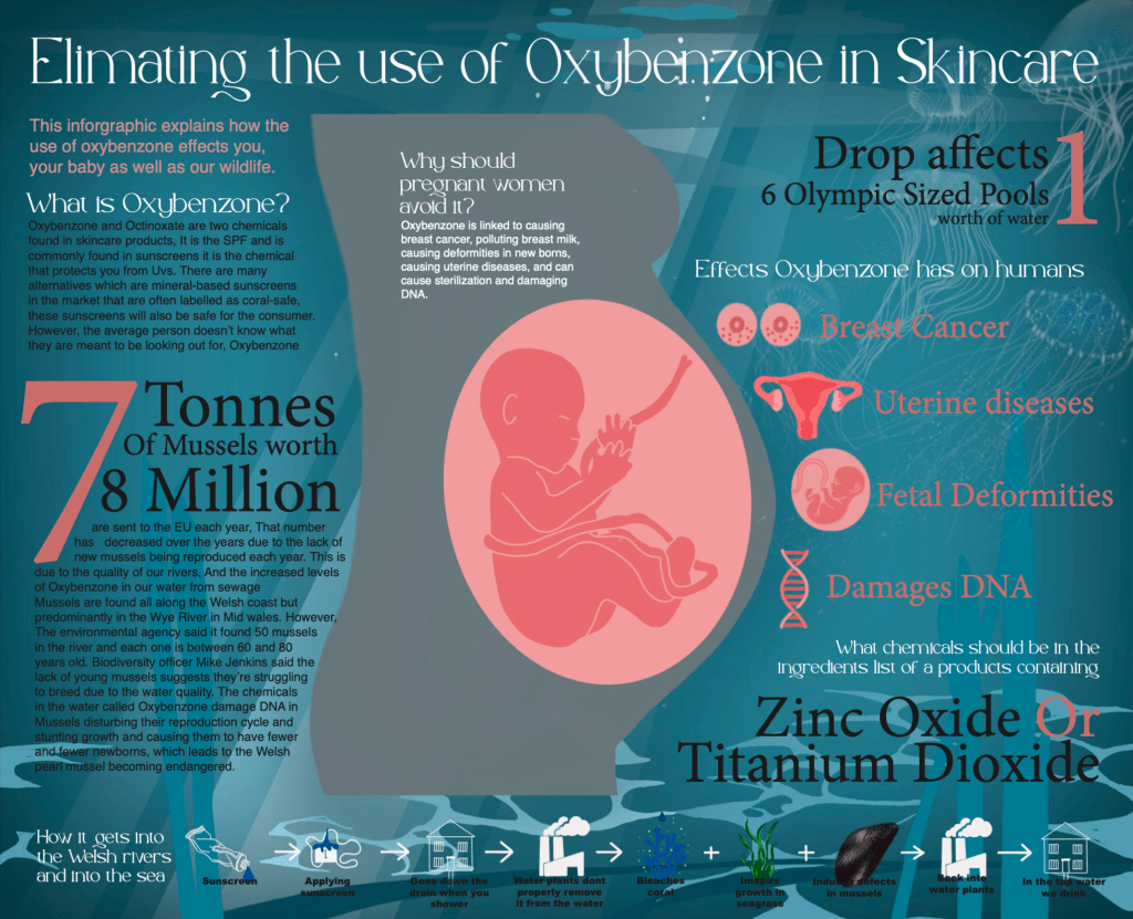 Through my research, I discovered that one of the groups most at risk from oxybenzone exposure is pregnant women, as it has been linked to potential harm to the developing foetus. With this project, my aim was to raise public awareness of what oxybenzone is, its potential dangers, and how to identify and avoid it in skincare products.