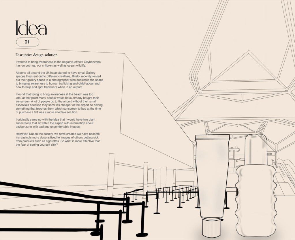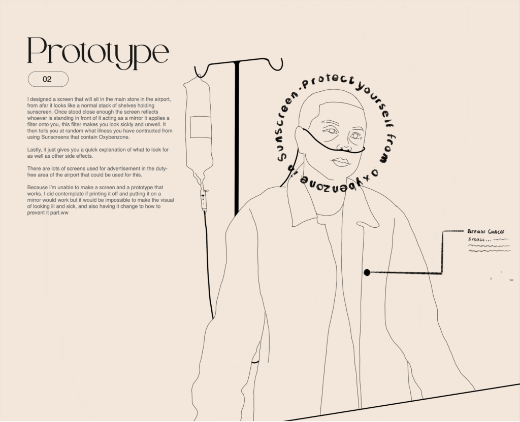 My disruptive solution was to have a screen that was descised often as a part of the shelf of sunscreens but once you stand in front of it it changes. It reflects the person standing in front of it and generates a disease often caused by oxybenzone. With this it reflects the person sick with this disease analysing, what’s wrong with you and why you got It.
